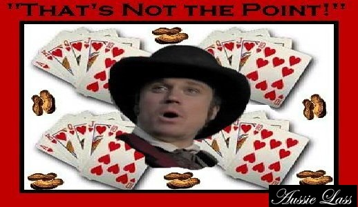 Author Comment: Hi! This is one of those stories that started going somewhere and ended up somewhere else. By the way, I want to thank all of the wonderful people who took the time to comment on my previous stories. SPECIAL THANKS to Darla who rides every journey with me. And to Deb, who's honest comments helped me to develop this into a better story. Thanks, girls. "That's Not the Point!" The atmosphere had become tense. The lanterns flickered in the room casting unholy shadows on the hard faces of the men collected. A silence had descended over the group. Ezra’s hands flashed. This would be the last hand and they all knew it. The seven men eyed the pot in the middle of the table. Buck licked his lips in anticipation. With that, he could have himself one fine time. Chris lit another cigar and frowned. “Get on with it, Ezra.” Larabee was not a patient man. The regulators' table was situated in the corner of the room, away from prying eyes, but with a clear view of all of the entry and exit points. Josiah started tapping his fingers on the table. The pressure was getting to him. Nathan, on the other hand, was shaking his head with disgust. The town’s healer hadn’t had one decent hand all night. Nathan looked down at the few dollars he had left to bet. Not much, but it may be enough if he received anything halfway reasonable. “Make sure you shuffle them good, this time. I want something that at least rates as a hand.” “Gentlemen, as this is likely to be the final hand of the evening, may I suggest that we raise the stakes to something a little more stimulating?” “No,” Vin argued. “I can’t afford to lose anythin’ else.” Ezra’s face shadowed with true disappointment. While the thrill of winning was all that truly concerned him, he found the stakes embarrassing. Surely his friends could afford more. “Look, Ezra that may seem like peanuts to you, but I’m down to my last dollar.” “Me too.” “All right, all right. It was just a suggestion.” With a certain about of frustration, Ezra reflected on his friends’ abilities to manage their money. Buck always spent his entire pay by half way through the week and then lived off the generosity of anyone and everyone. J.D. wasted his on all manner of silly and useless things. Josiah’s pay appeared to be absorbed by the renovations to the church. Nathan earned just enough to break even. He only charged people what they could afford for treatment and medicine, and most people couldn’t afford much, so the difference came out of his own pocket. Vin... Vin puzzled Ezra. He’d never seen Tanner spend money on anything but food and the odd drink. Standish suspected that the tracker may have a secret stash - it was just a feeling. Larabee smoke and drank anything he earned... well, that was a little unfair. The Seven’s leader had been spending most of his earnings on his ‘hovel’, to coin one of Vin’s phrases. The small cabin was situated just out of Four Corners and Chris rode out their daily, enjoying the solitude and the opportunity to keep both his mind and hands busy. Standish was drawn back to the situation at hand when J.D. started bouncing around in his seat. The youth felt excited. He’d had a good night and all things going well, he felt he might claim the pot. Vin Tanner slouched back in his chair, his eyes never leaving the cards in Standish’s hands. “You don’t trust me, do you Mr. Tanner?” “When it comes to cards, Ez, I trust you about as much as I’d trust a one legged man to win a butt-kicking contest.” “He stole that from me,” Buck claimed grinning. “Deal already, Ezra!” J.D. cried. Ezra’s perfectly manicured hands stilled for a second and then he issued the cards with the speed of a light. “Well, gentlemen I don’t wish you luck.” “In your ass, Ezra,” Buck snapped, attacking his cards with anticipation. The huge scoundrel closed his eyes, fanned his cards out in front of his face and then slowly lifted his eyelids. Larabee snatched his hand up with impatience. Vin reached for his and casually turned the cards over. Nathan shook his head once more before lifting his cards from the table. “Lord, I need a little luck,” Josiah muttered as he raised his five cards and peered at them. Standish collected his own but he didn’t look at them. He was too busy studying his opponents. Ezra could read each like a book; it was just a matter of taking the time to observe them one at a time. With a muttered curse, Vin threw his hand down on the table - Tanner had nothing. Larabee had started munching on the end of his cigar - he had something worth betting on. Nathan’s face was screwed up with disgust. Obviously his run of bad luck hadn’t improved. Buck’s moustache was twitching - he was about to bluff. J.D.'s eyebrows were drawn down in concentration - he was torn between what he should keep and what he should discard. Josiah was trying not to smile but failing miserably - so that meant any threat would come from Larabee or Sanchez. Ezra glanced at his own cards, his poker face showing little reaction. “Four,” J.D. stated paying into the mound on the table. “Four dollars?” Nathan shrieked. The healer thought long and hard staring at his hand. “You in or out, Nathan?” “In,” he healer grumbled. “Me too,” Josiah stated, the corners of his mouth betraying him. “You’ve got something!” Buck boomed. “I don’t know what you mean, brother.” Chris tossed his bet into the pot and then turned to Vin. “Hell, I’m likely to get killed hanging around with you boys, so I may as well live dangerously,” the tracker claimed. “I’m in.” Buck’s moustache began twitching with vigour. “Yep, ole Buck’s in.” “As am I,” Ezra stated. “Now, who would like some cards?” “I’m fine,” Josiah stated. “See! See, what did I tell you? The bastard has got something!” Buck bellowed. “Mr. Wilmington?” “Yeah, um, okay. I’ll tak