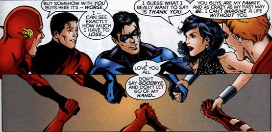 These five are the original sidekicks of DC. They are the characters who grew up together in front of reader’s eyes. The bond between them supersedes partners and friends and is closer to family. No matter where life takes them, these five will always hold a special place in each other’s hearts... or that is how it should be. DC writers who either don't know or don't understand the characters well, don't always represent this bond well. However, this group’s special relationship was celebrated in " Secret Origins Annual #3" when the team comes together to save Dick from Antithesis and in “JLA/Titans: the Technis Imperative” 1999 where they save the day when no one else can. In the moments before they believe they are going to die, they share of their feelings toward each other (Thank you Devin Grayson. This is a DC writer who does understand the bond between the original Titans)